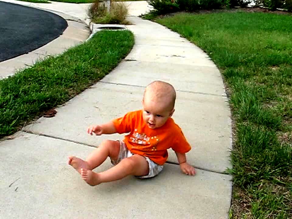 Baby boy scoots across the sidewalk on his butt, it sounds like sandpaper rubbing against the ground.