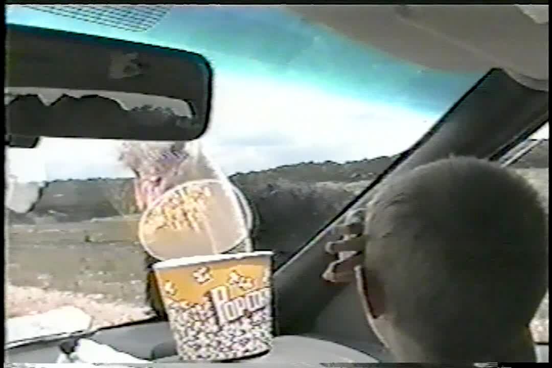 "Popcorn Pecker" Ostrich tries to eat popcorn sitting in a car, through the windshield. Bird.