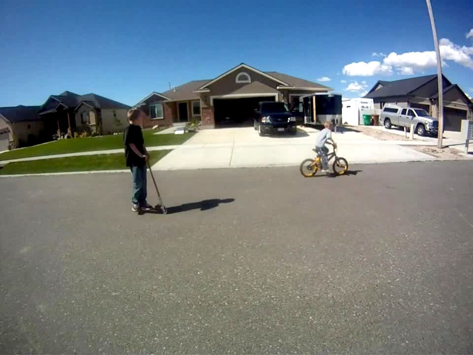 Boy riding bike down street while wearing helmet camera crashes/runs into girl on bike. POV shot.