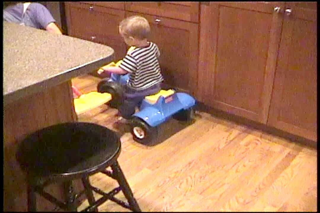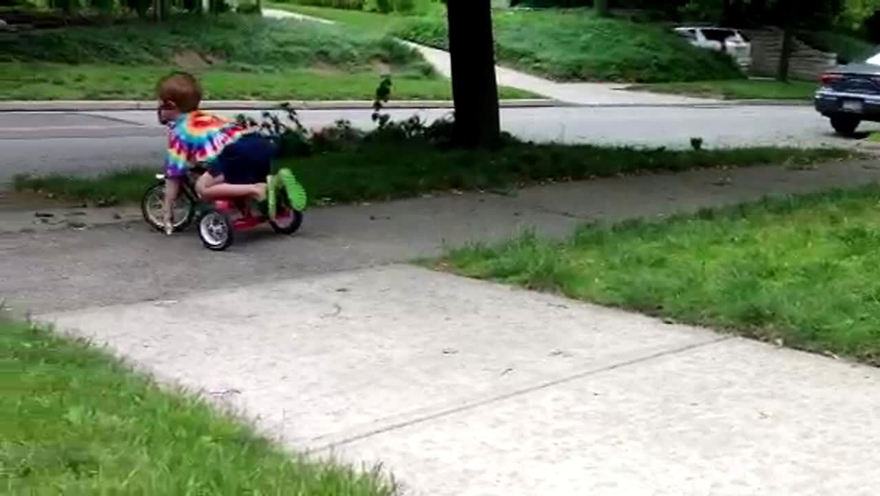 Tot girl slams into the back of tot boy's tricycle, knocks him off; he cries.