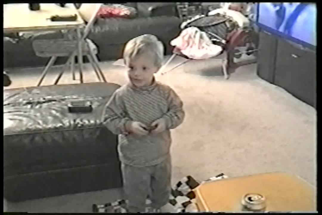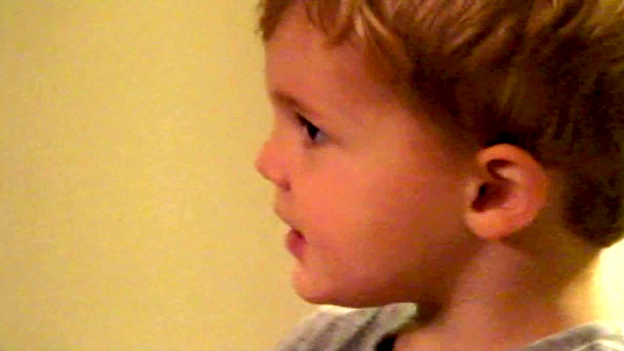 Little boy says his ABCs. Man asks "Can you do them backwards?" and boy faces the other way and says them again.