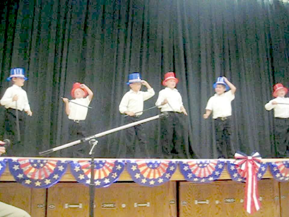 Boys sing "Yankee Doodle" and dance onstage, tot boy gets stuck in front of the curtain and knocked down by another boy. No recovery. Long for edit. Performance problems.