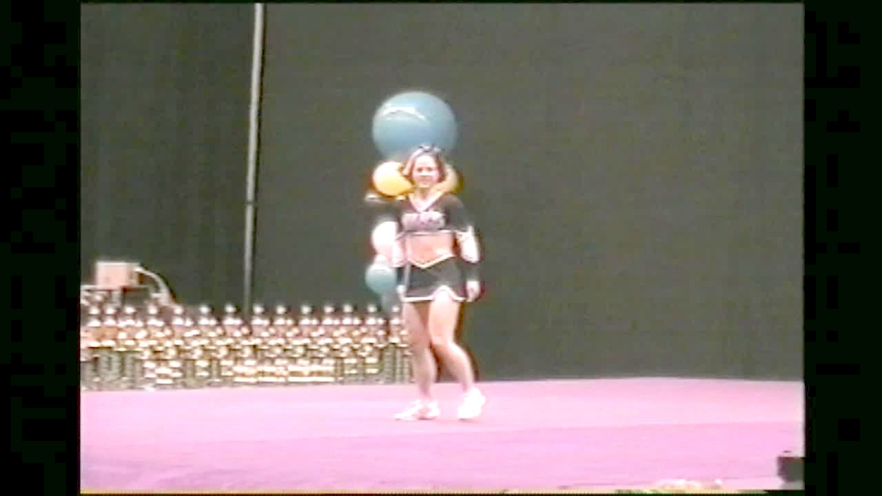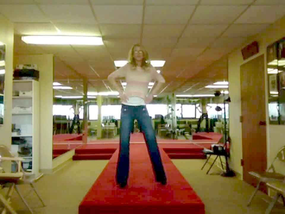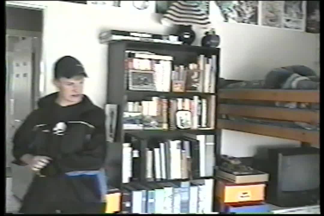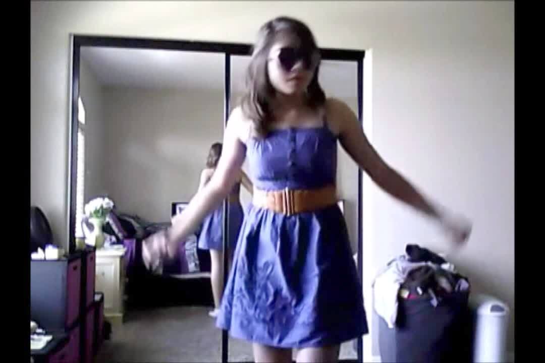 Teen girl in dorm room sings / dances / acts silly to Celine Dion music. She swings her body up to the edge of the bunk bed, throws her head back and hits it really hard on wood from the top portion. Holds her head.