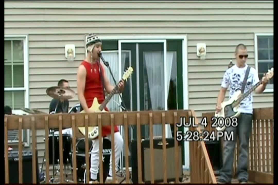 Man sits in a deck chair and plays guitar and sings with teen boy. The chair suddenly breaks, he falls over.
