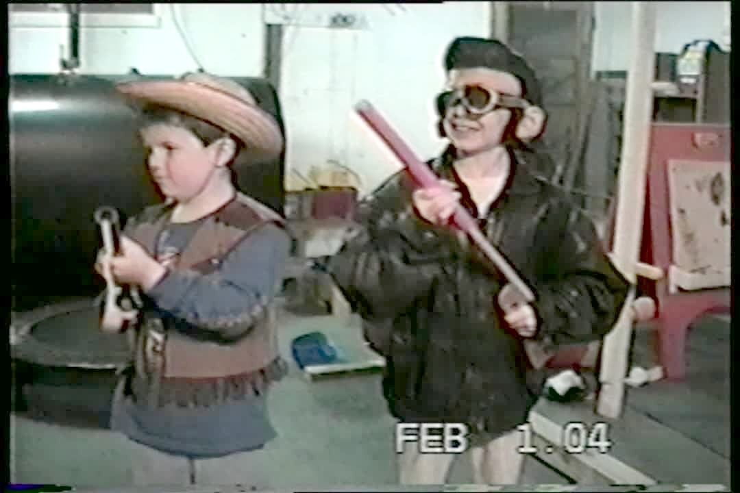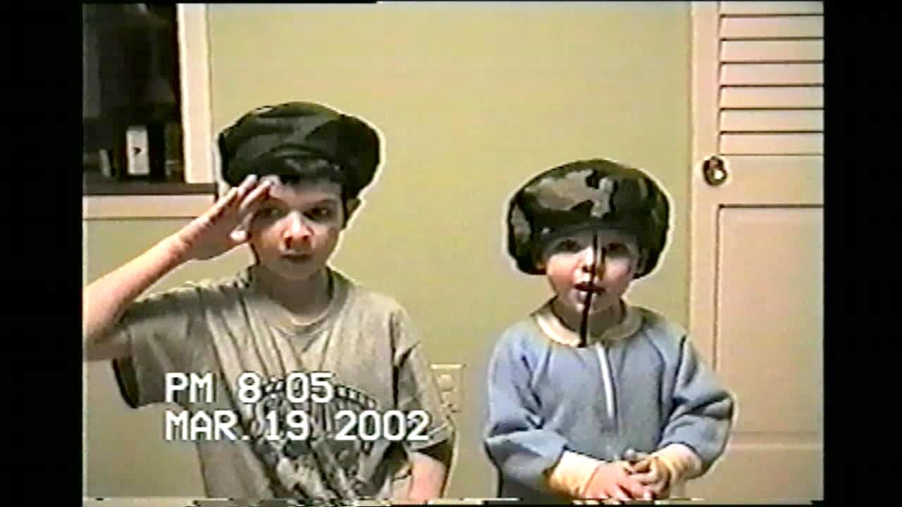 Both in camouflage hats, tot boy sings "Star Spangled Banner" while older tot brother salutes.