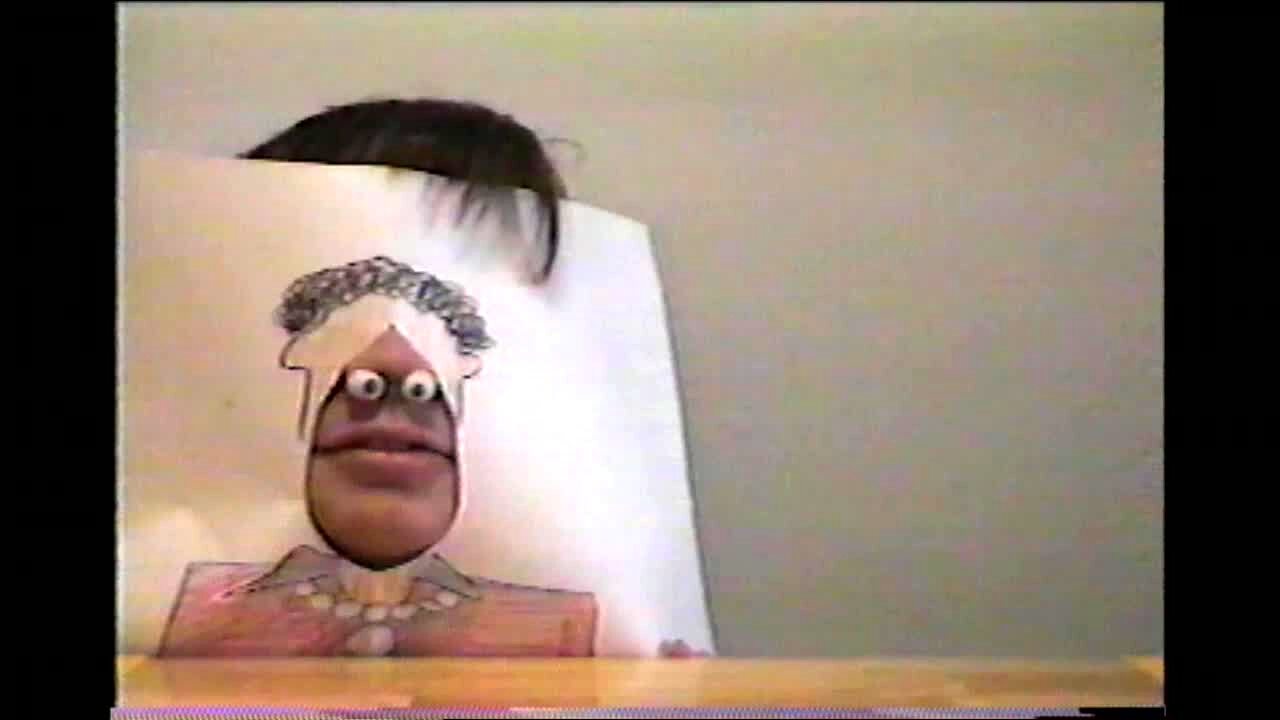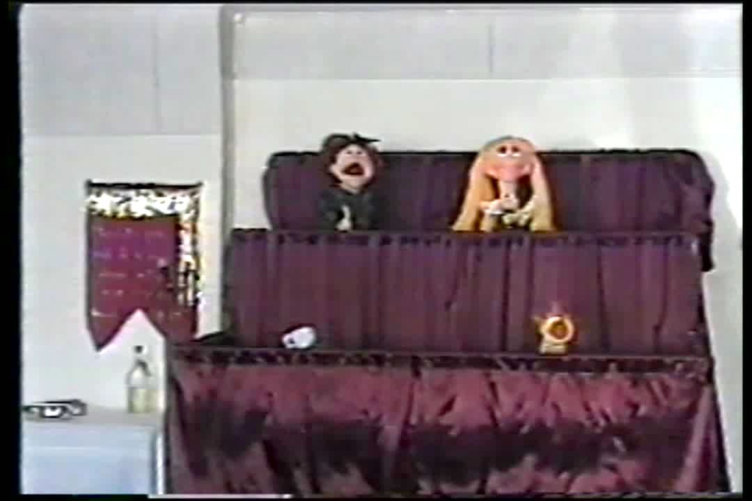 During a puppet show, the front mat falls down exposing a boy and girl with hand puppets. 2 stage hands put the mat back on. Performance problems.