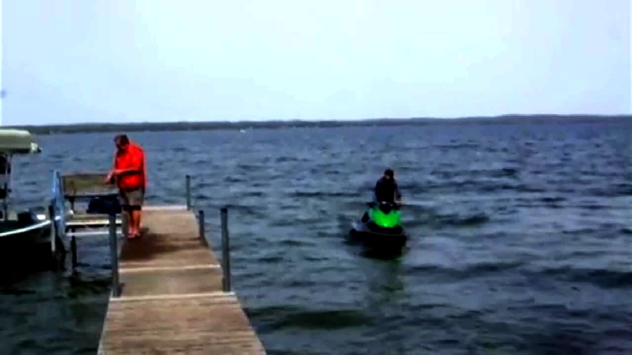 A man on a jet skit knocks a fisherman off of a dock by spraying water at him.