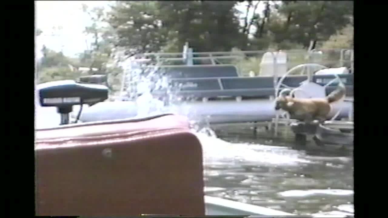 A little boy runs and tries to jump off of a dock but comes up short, bouncing off the wood and into the water. Start at 0:44.