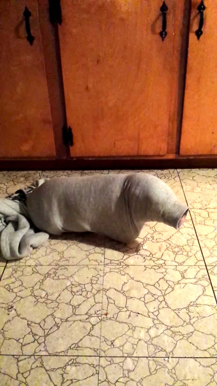 A mini pig stuck in the sleeve of a sweater squeals and shakes around, trying to get out.