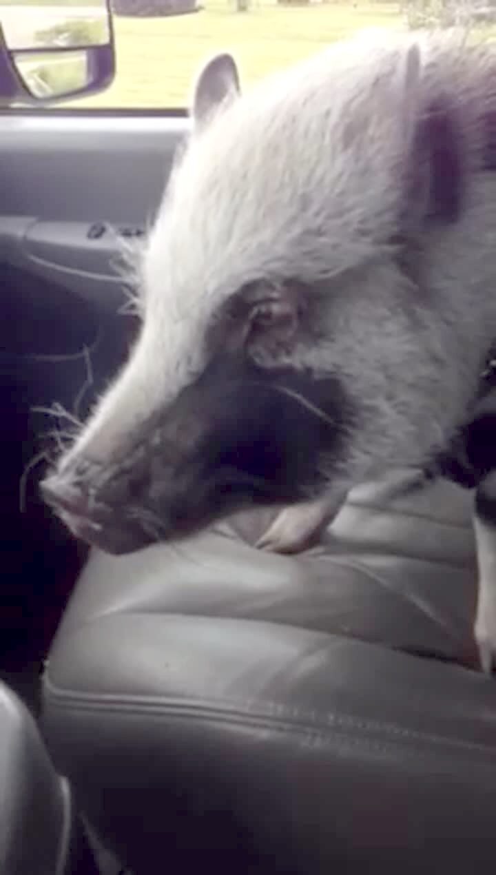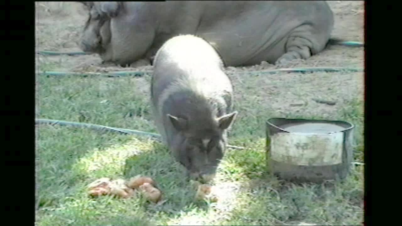 Woman holds baby pot bellied pig in her arms as man feeds it. Pet pig makes loud screeching / squealing noises, then makes funny sounds as it's chewing food.