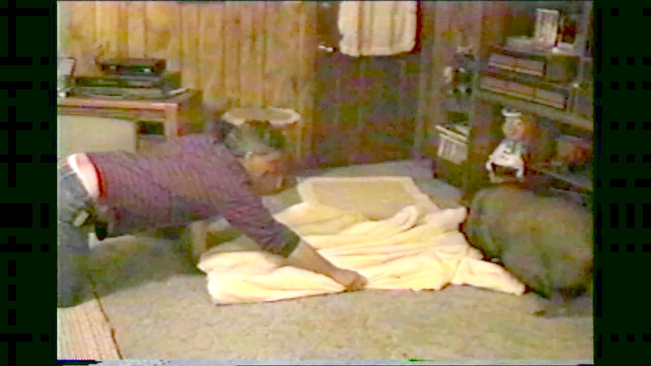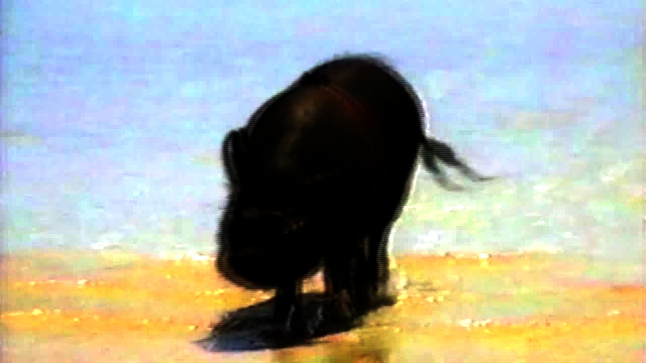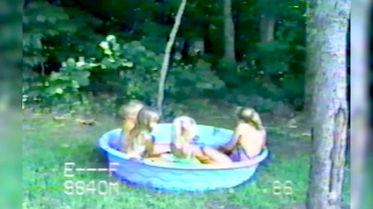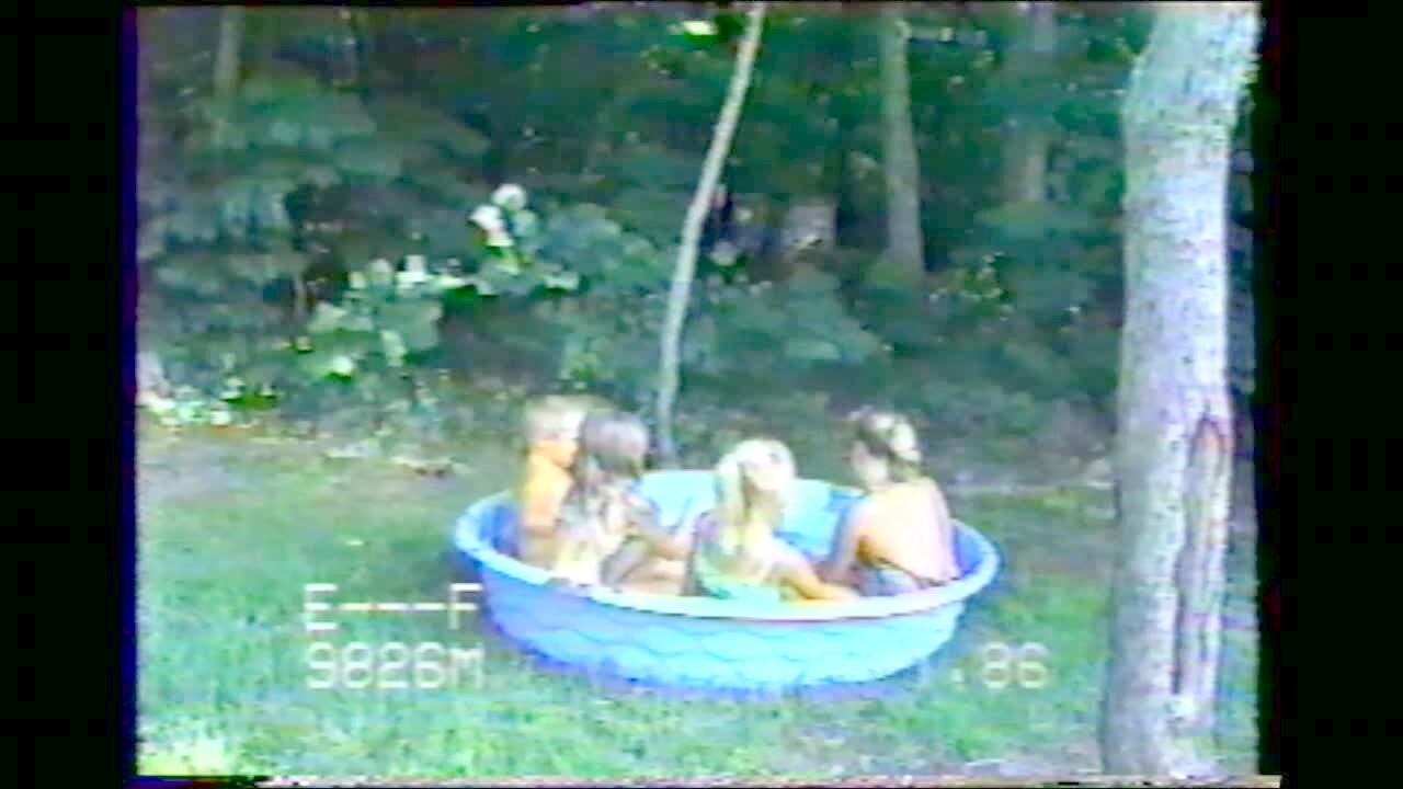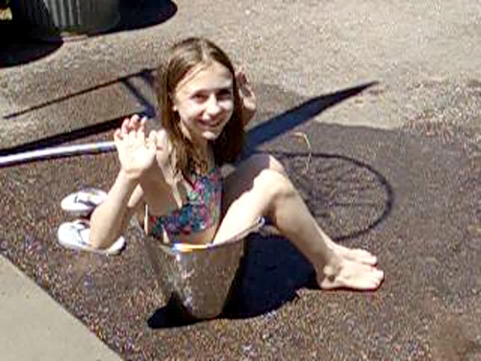 Young girl sits in a bucket of water in parking lot. When she moves up and down, it sounds like a pig snorting. Good for What's That Sound.