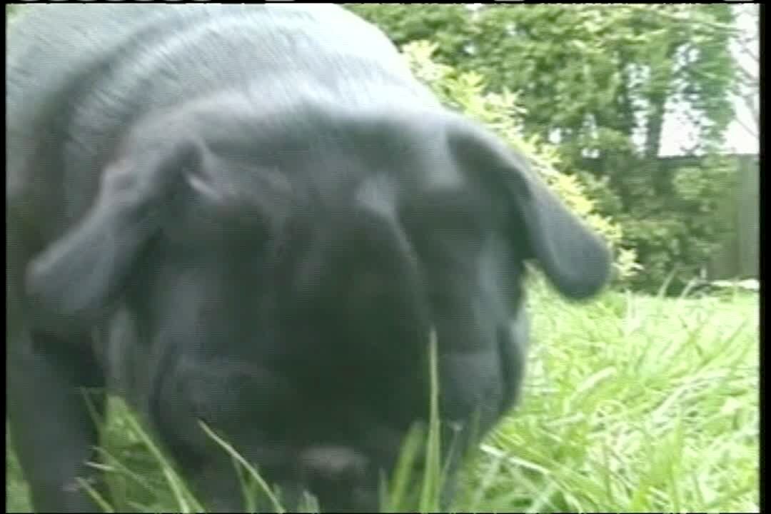 Little black pug dog chews loudly on grass. Camera is close to dog's face.
