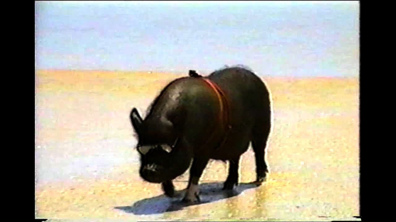 A hungry pig snorts and walks around her tub of food outdoors. She jumps on top, slips off, then jumps up again, kicks off the lid, and eats out of the container while her owner scolds her from behind the camera.