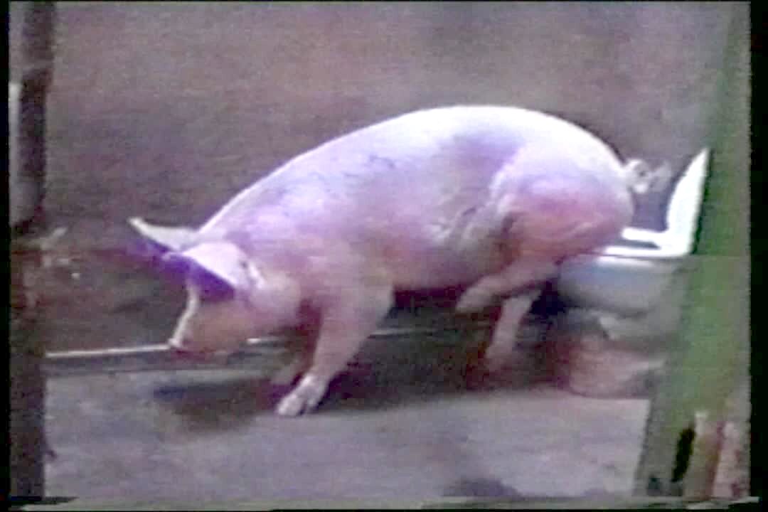 Pig bites at a beer can, it explodes. Pig continues to chew on it. Farm, barn.
