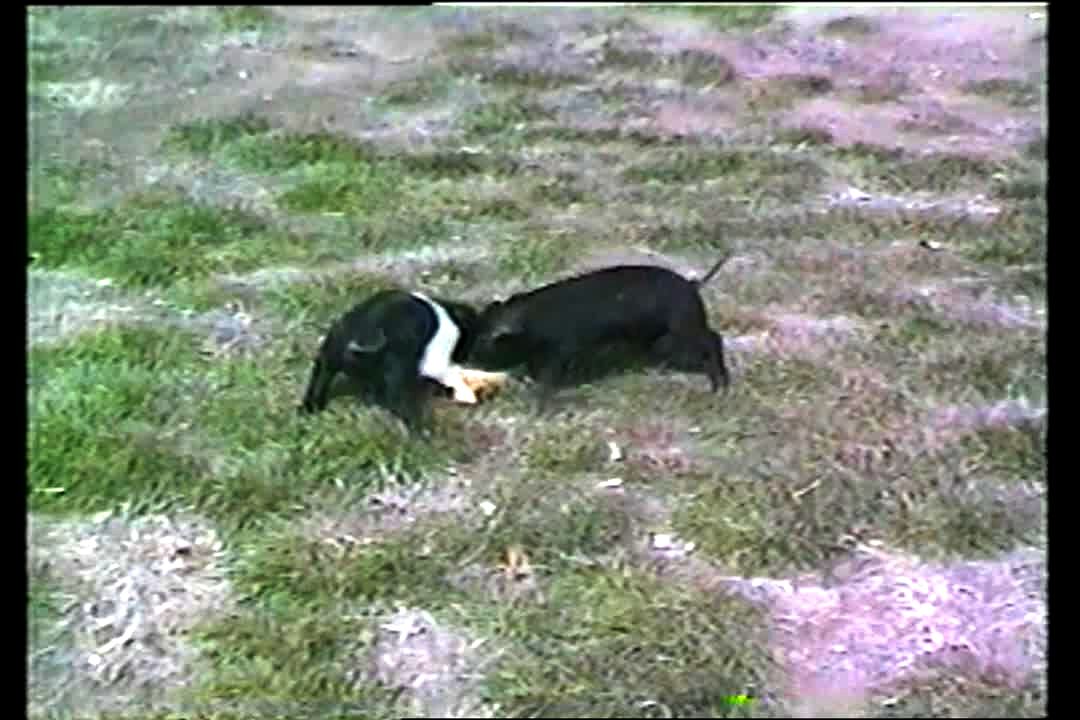 PIGS. 2 pigs at bowl revolve as they fight over food.
