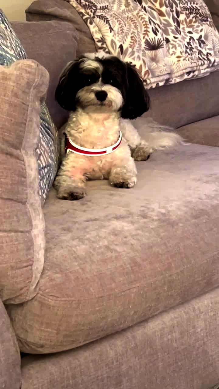 A woman gasps at her dog while he sleeps on a couch but jumps up when he hears her.