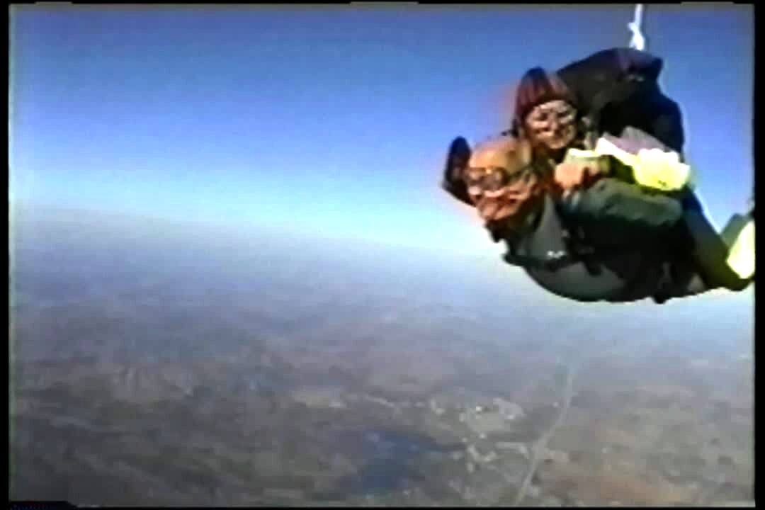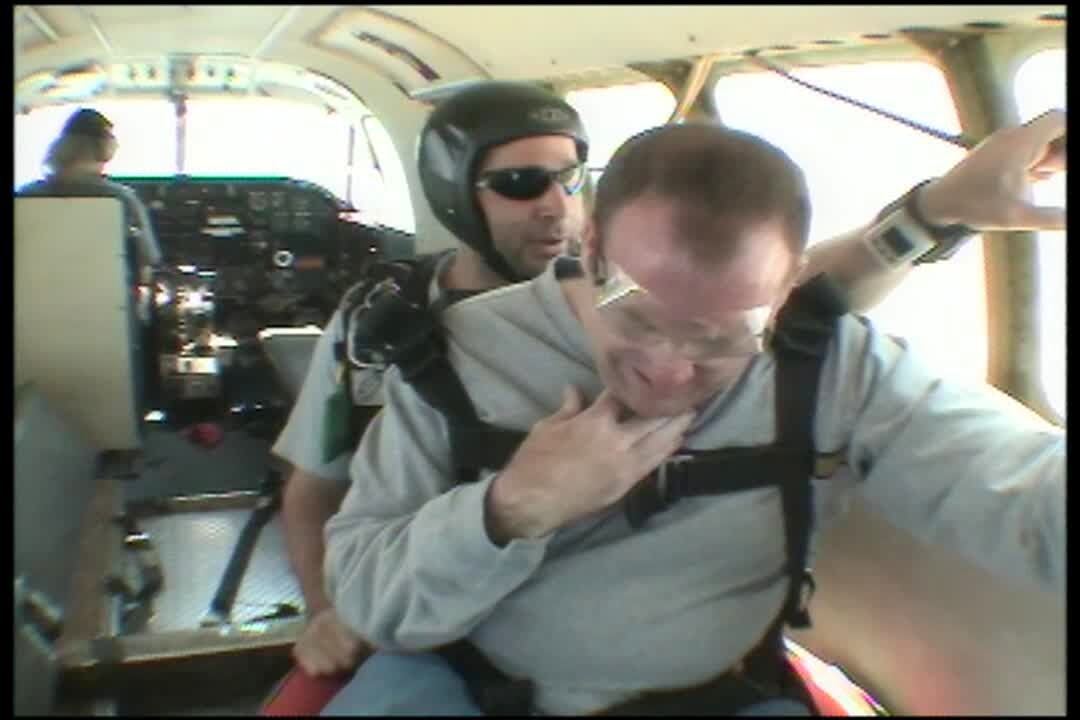 "Skydiving Diva" Skydiving man freaks out at door of airplane. Yells "I'm scared!" tries again, jumps.Tough guy gives commentary after failed attempt. Long for edit.