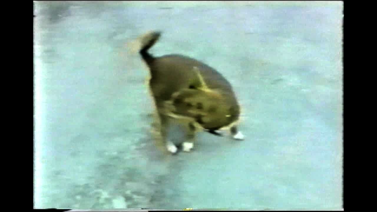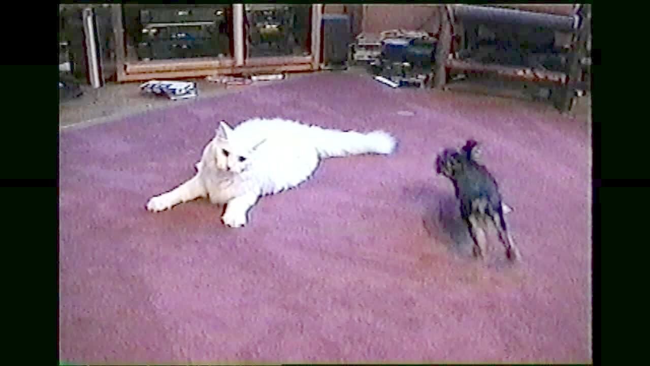 "Four-Legged Frenzy" Cat fights with Rat Terrier. Dog runs all over while cat sits in 1 spot waiting to scratch dog when it gets too close.