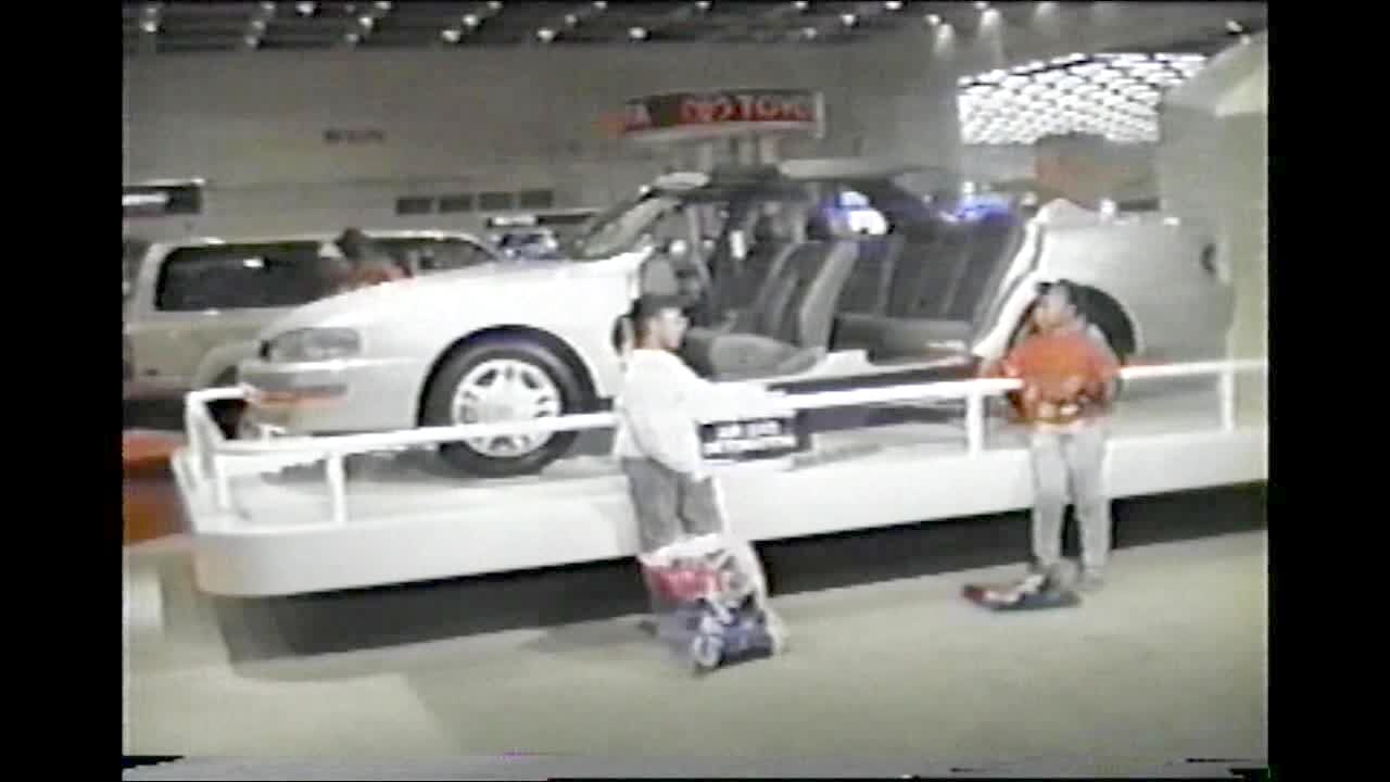 2 girls at car show are scared when air bag is demonstrated.