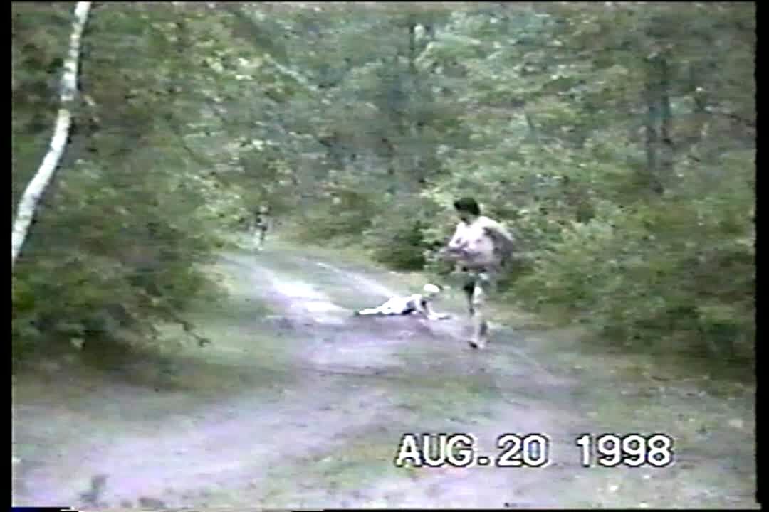 Little boy runs down road, man jumps out of bushes and scares him, boy falls