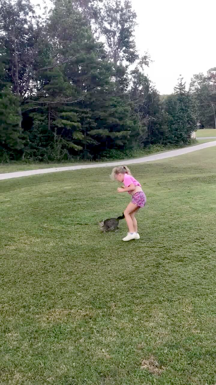 A cat jumps on a young girl's head when she does a cartwheel in a yard.