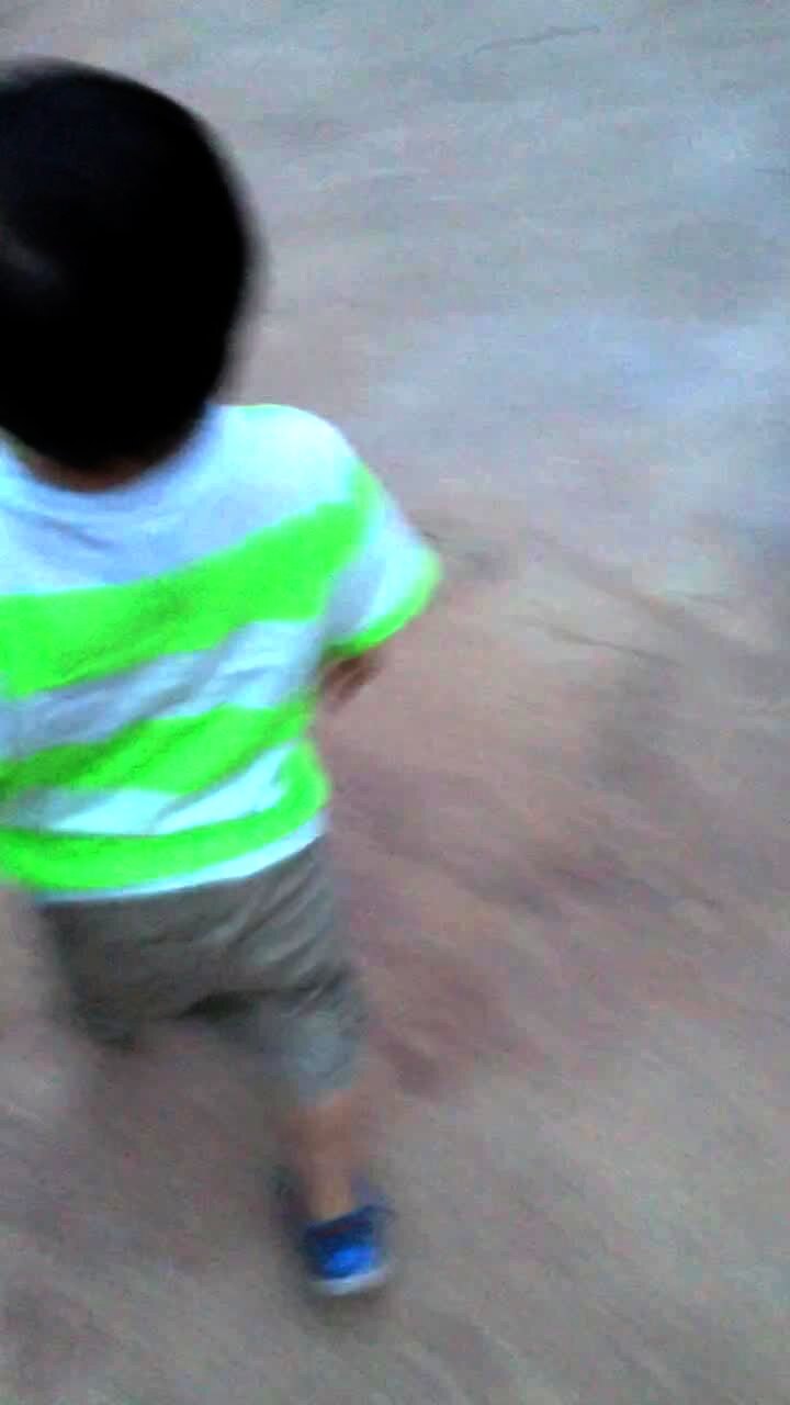 A young man falls on a walkway while trying to scare a tot boy outdoors.
