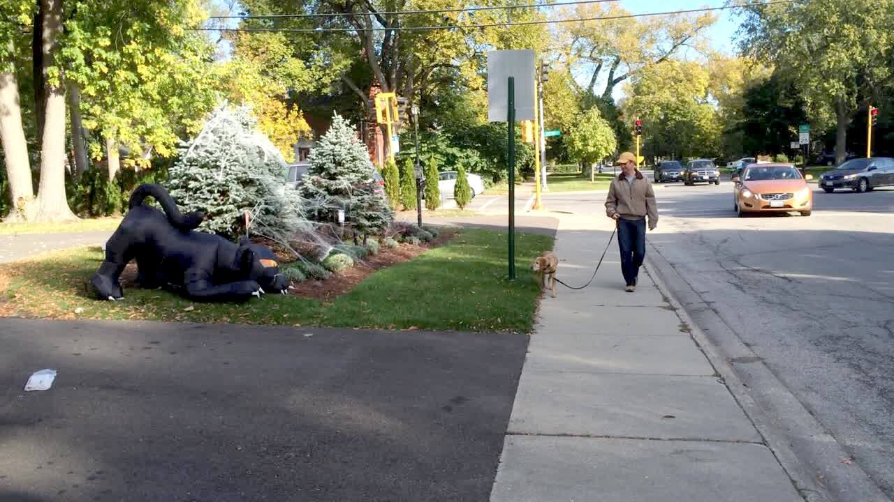 A man walks his dog outdoors when they pass a large moving cat Halloween decoration and the dog jumps away off the curb as the man stops him from running with his leash. Scare.