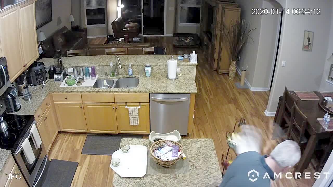 A cat jumps onto a ceiling light in a kitchen and makes it swing, then falls off of it. Security footage.