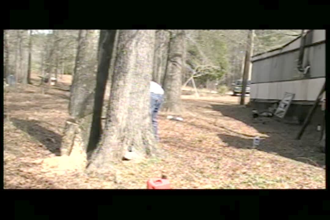 Man cuts down a tree near a trailer house. Tree falls and crushes roof. Men try to turn off electricity and gas lines to the house.