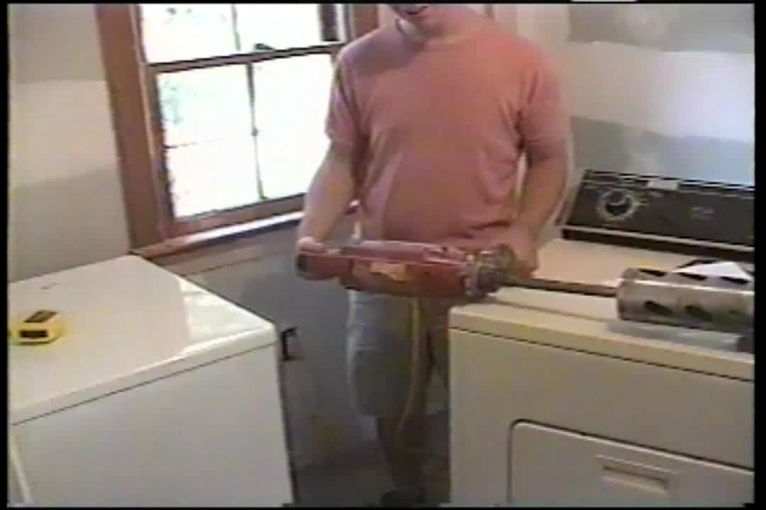Man shows HUGE drill and talks about how manly he is. The drill bit falls off and makes a huge noise. He laughs.