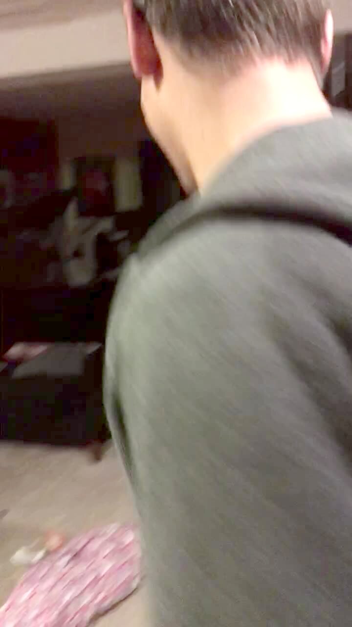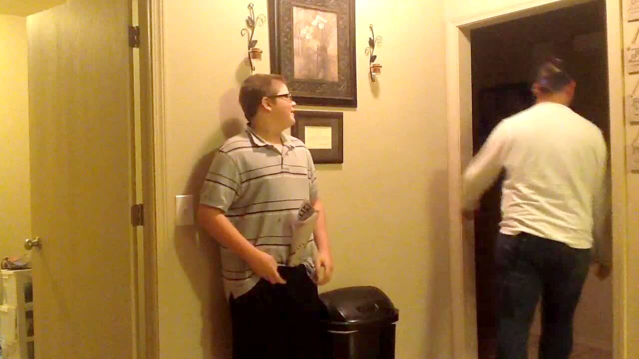 A teen boy opens a door and screams when another teen jumps out at him and shouts. The scared boy's pants fall down. Practical joke.