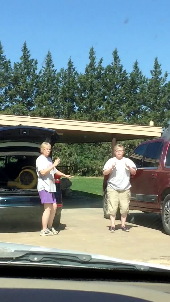 A woman struggles to get out of a port-a-potty while a car presses against the door. The car backs up and she gets out. Practical jokes.