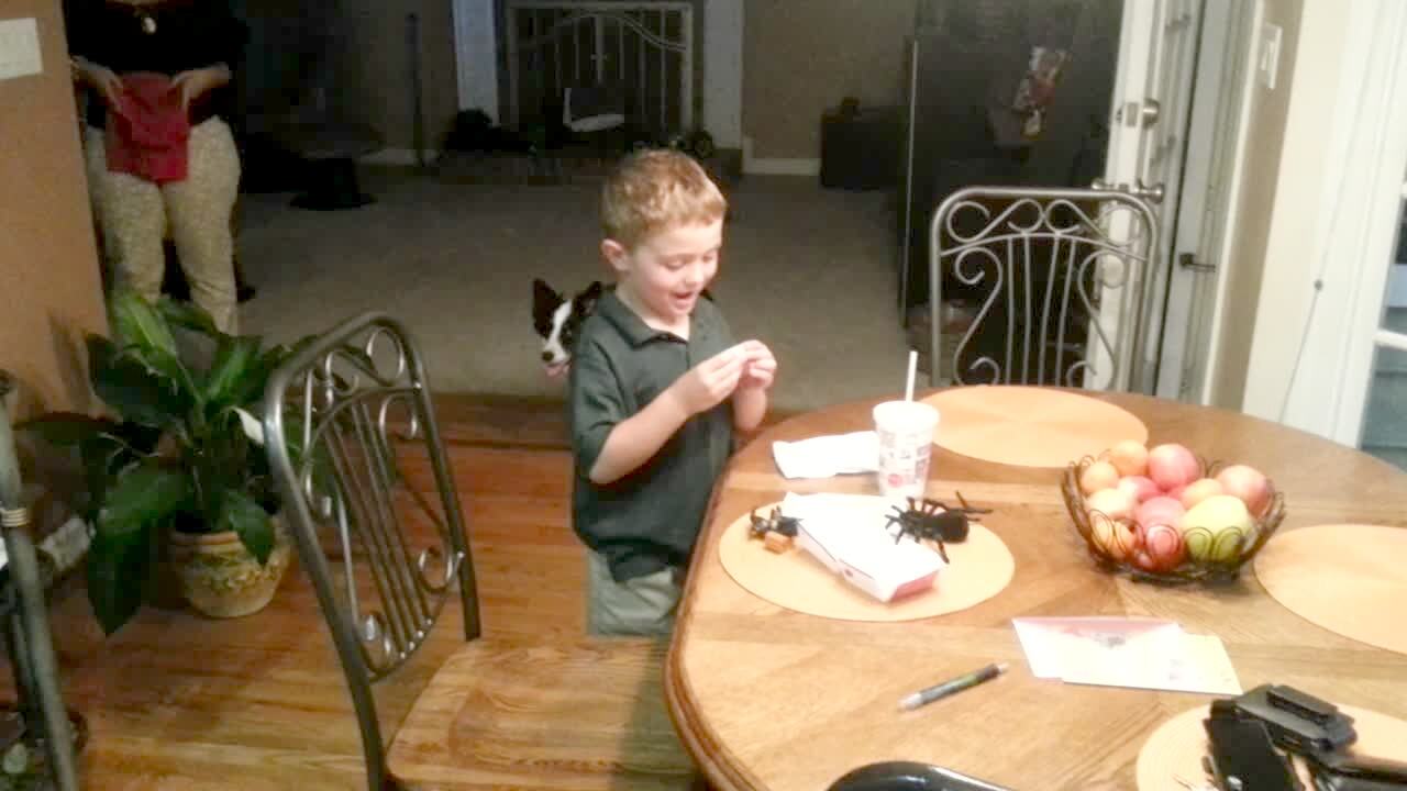 A boy screams and runs away when he sees a fake spider on the table. A woman and two dogs are visible. A man is audible.