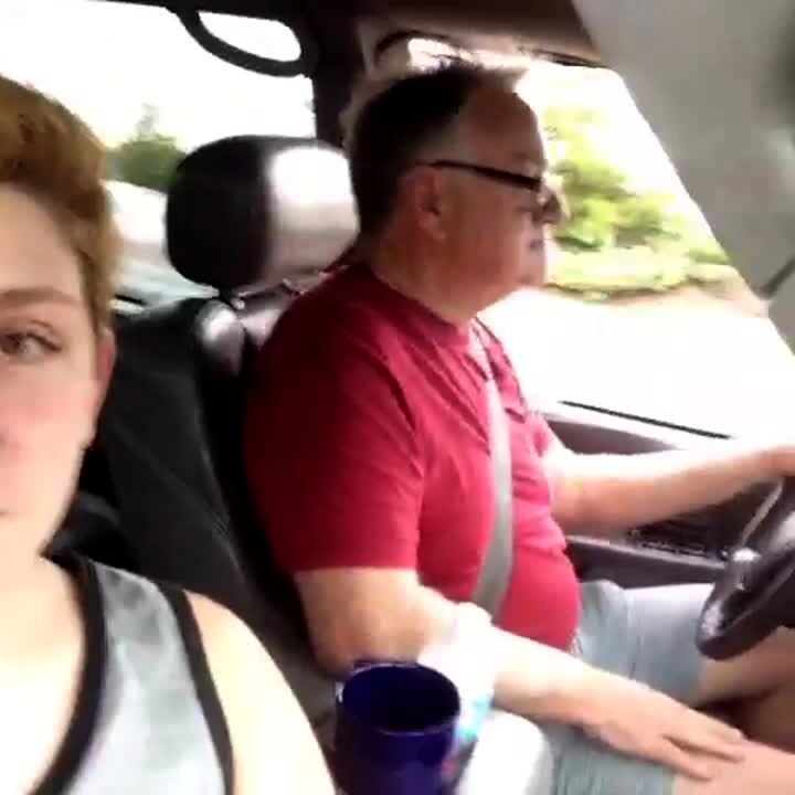 A teenage boy scares his dad while he drives a car. The man snaps at the boy and calls him a butt head. Short tail.