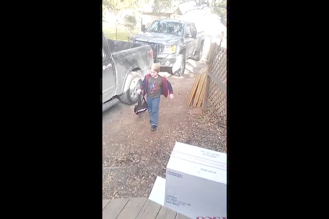 A boy running home from school is scared when a boy pops out from under a cardboard box at him. Action at :09.