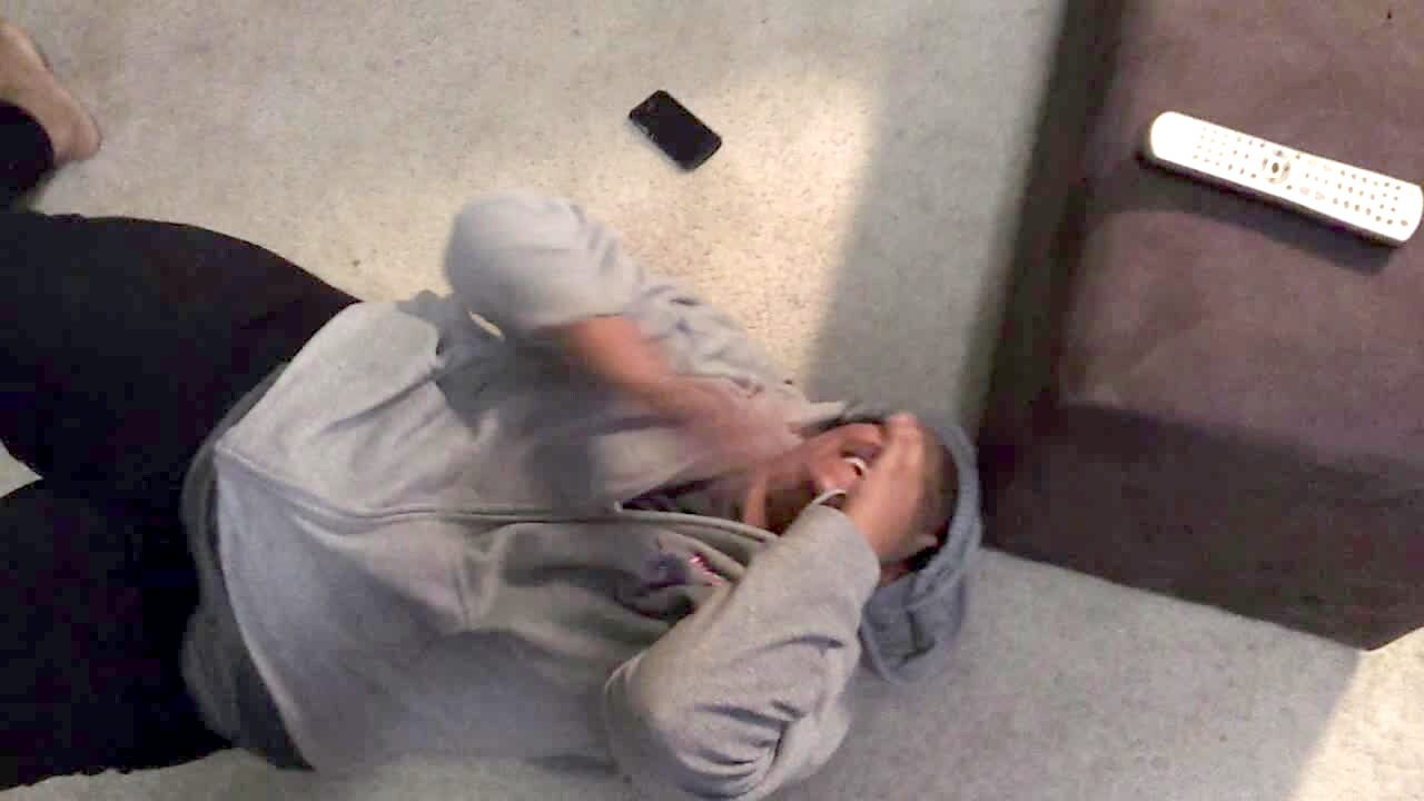 A young man lies on his stomach indoors as a remote controlled car runs at his head. Adults off camera laugh.