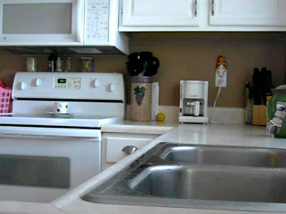 Man puts a rubber band around sink sprayer & get daughter to turn it on. She screams & whines off-camera. Practical joke.