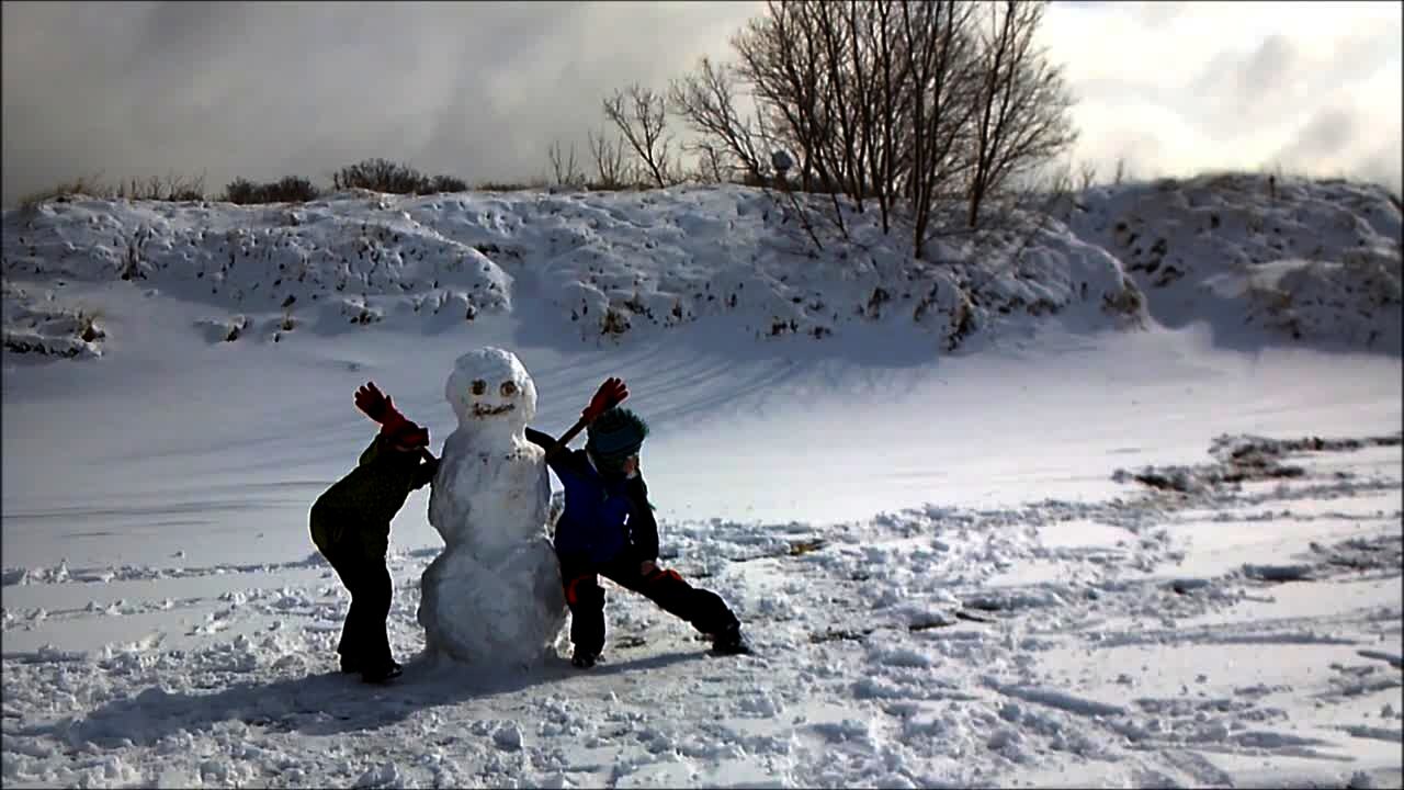 Two boys pose with a snowman outdoors before running away and letting a truck run it over.
