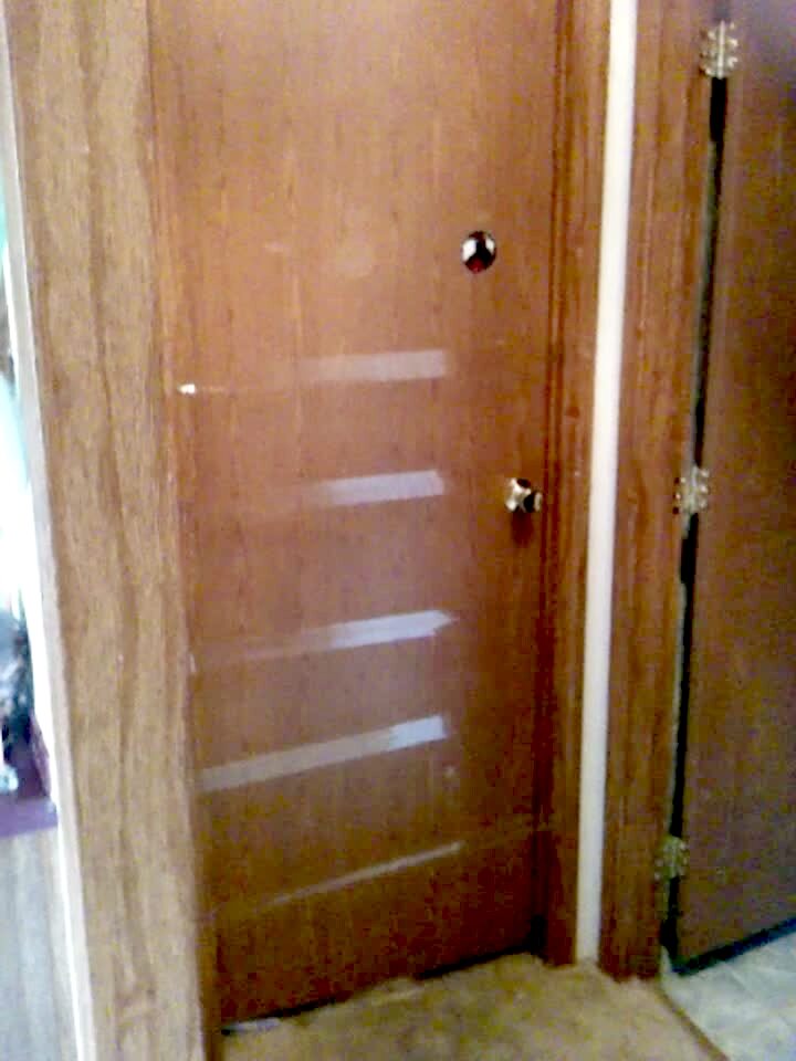 A man has placed clear tape across a doorway, and then calls to two girls, one of whom runs into the tape. Practical joke.