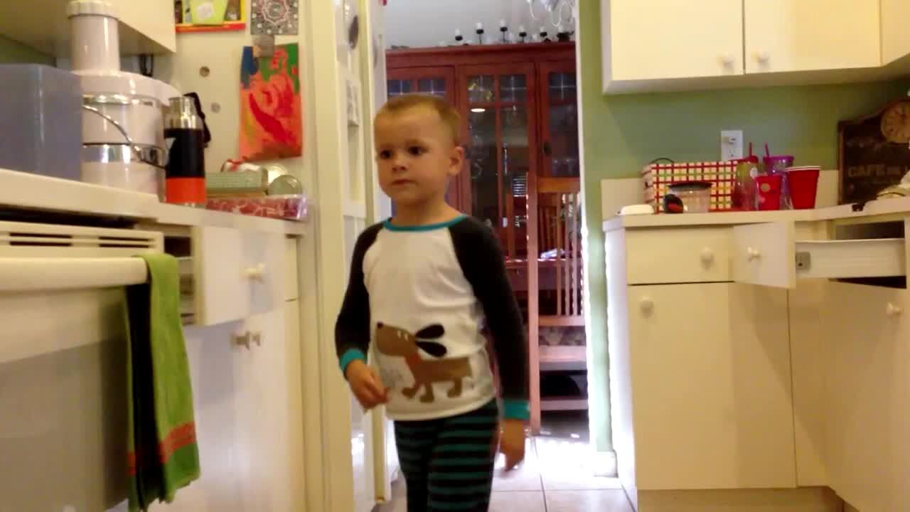 "Kitchen Cabinet Kid" Children hide in cabinets to reopen drawers as their little brother closes them.