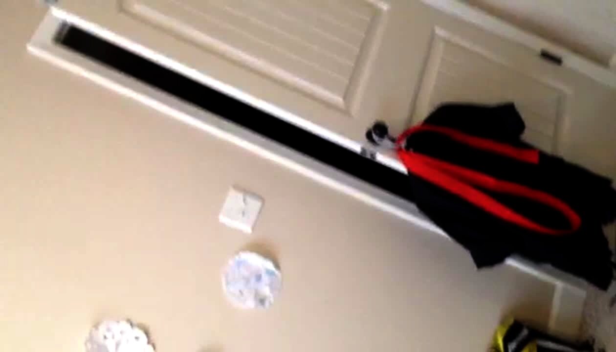 A teen boy gets his brother to open a door with a bucket of water on top of it. Action at :15. practical joke
