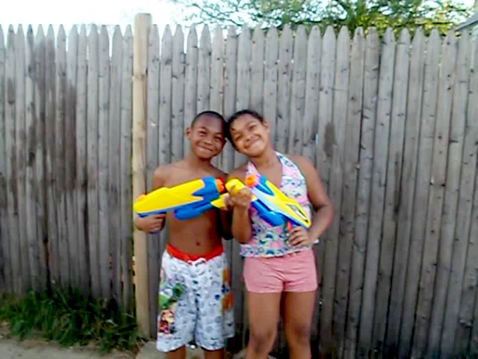 A young boy and girl think they're posing for a picture with squirt guns and then a man dumps water on them. Everyone laughs.
