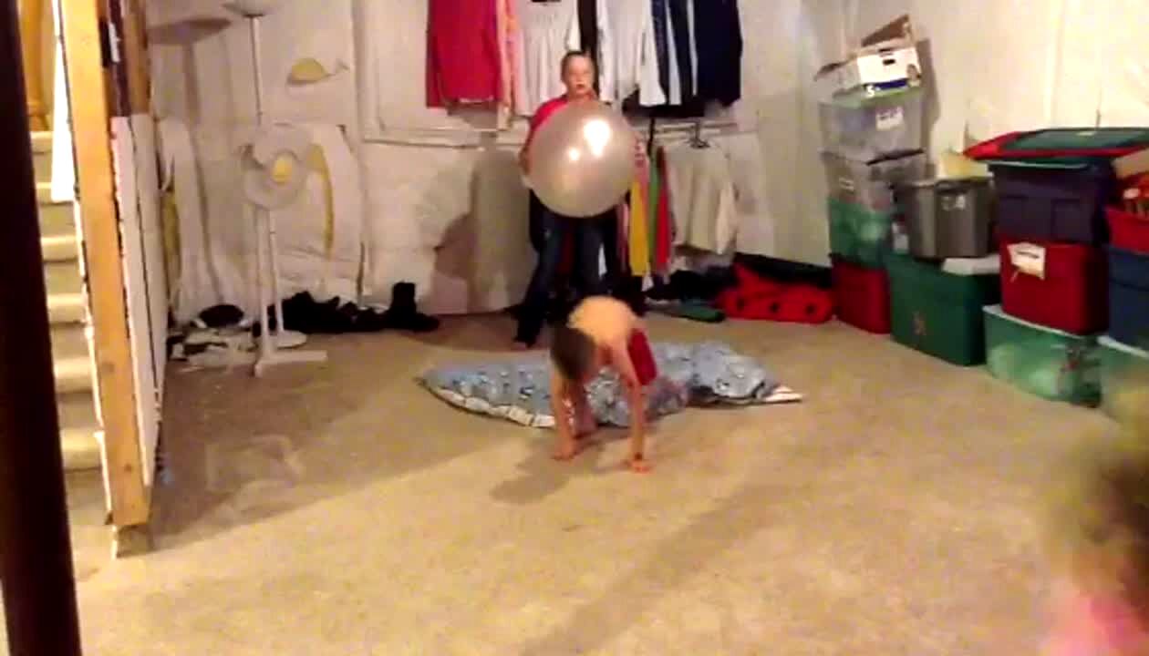 Several kids take turns running into a yoga ball while a young girl holds it. She runs out of the way and a boy runs into the wall behind her.