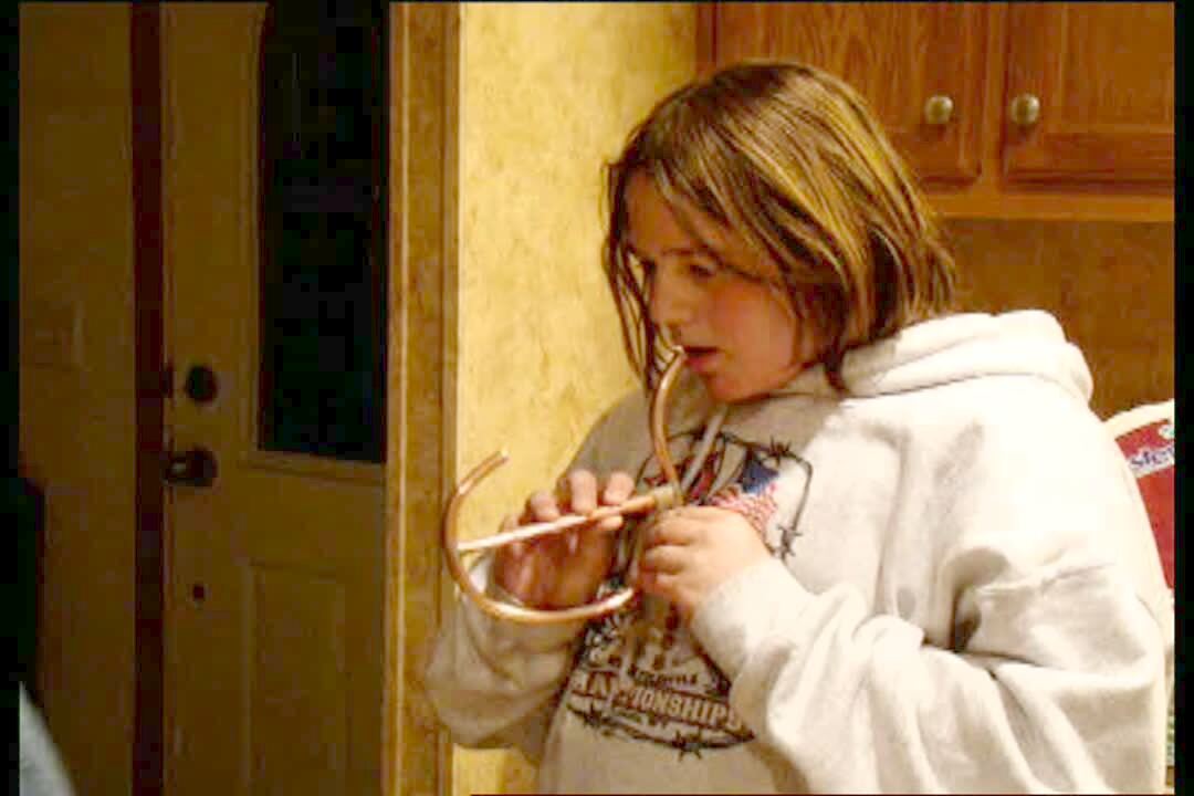 Teen girl blows into an elk bugle and gets blue powder all over her face and shirt. Practical joke / prank by her father.
