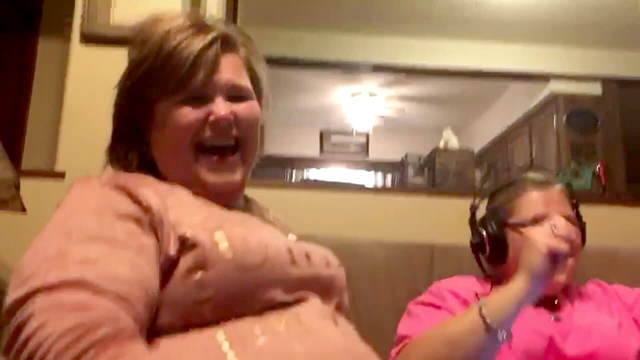 A woman tells her parents she's pregnant. Her mom screams and runs around. She falls to the ground screaming "Oh my god!" repeatedly. Same clip as 726711. Use this one.