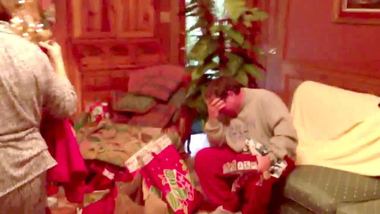 A teen girl, a woman, and a man open up Christmas presents that reveal that they're going to be grandparents and an aunt. The future grandpa man cries hard because he's so happy.