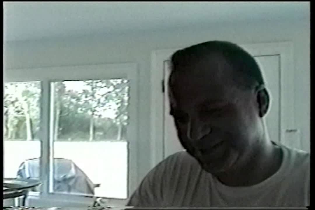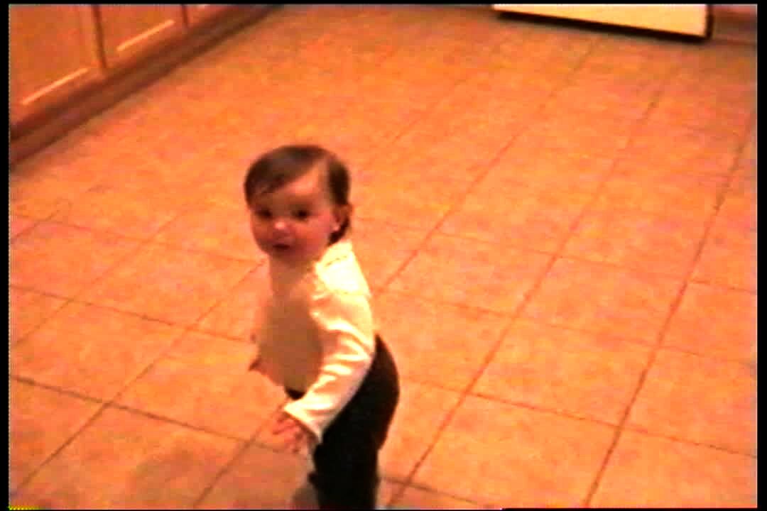 Tot girl in kitchen is asked by man "How does mommy stand?" Girl puffs out her stomach because mom is pregnant.