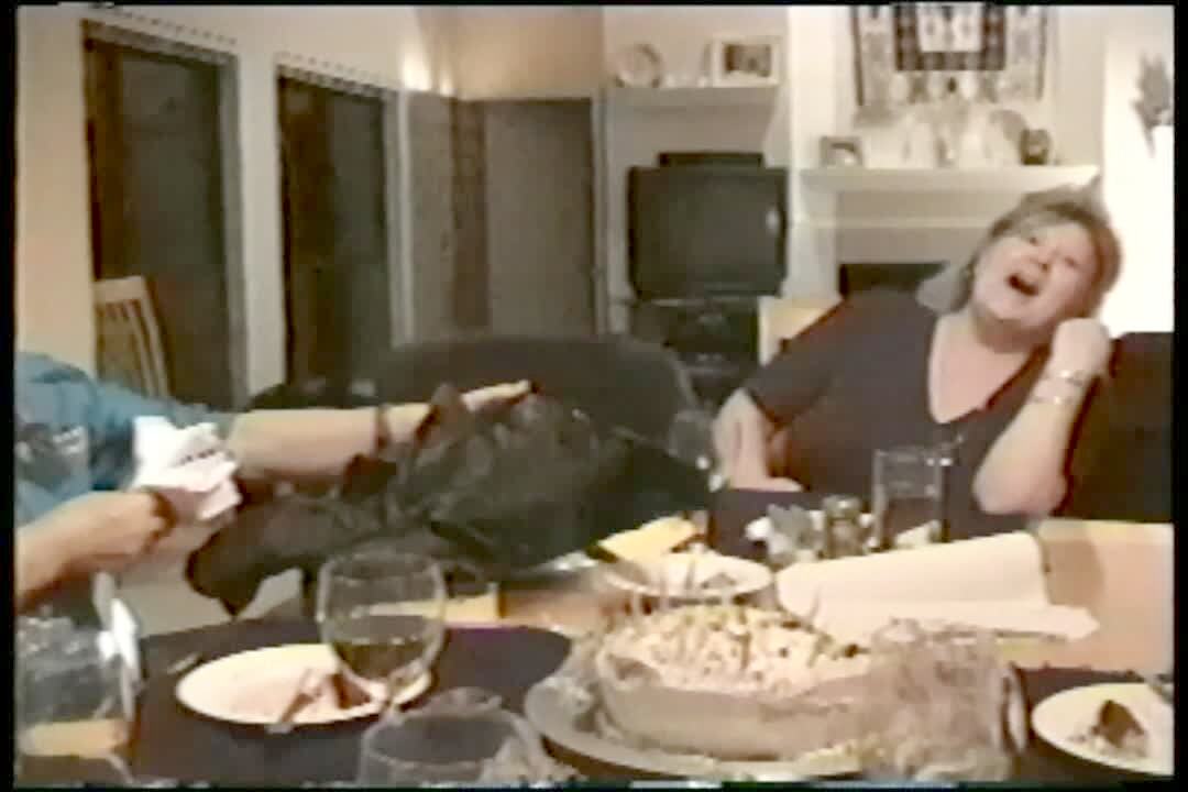 A family is sitting around a dining room table and the mother is opening a present. When she sees what is inside she screams and walks around the kitchen while the rest of the family laughs, revealing a positive pregnancy test was the present.