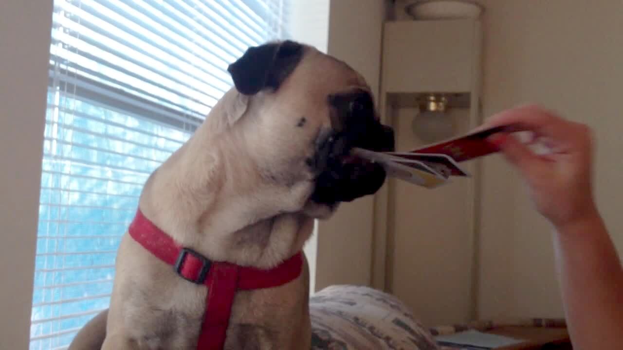 A Pug dog bites at the air from a leaf blower in slow motion.