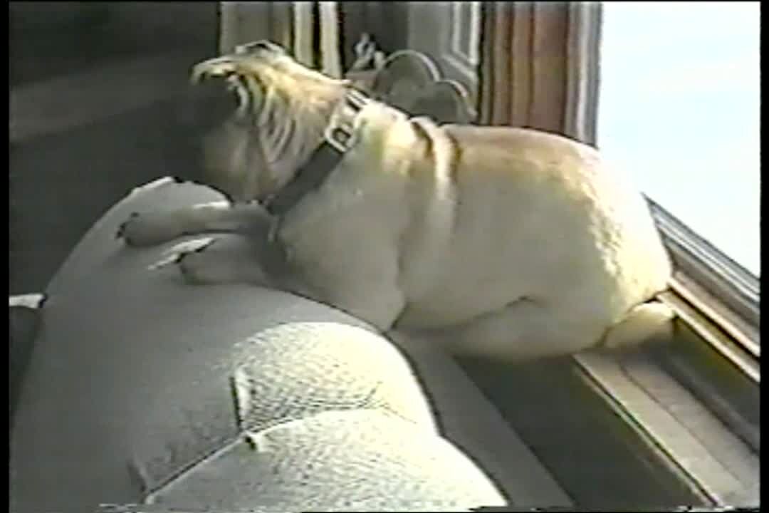 A dog sits in front of a window in the living room and gets scared and falls back whenever a man outside sprays water from a hose at the window.